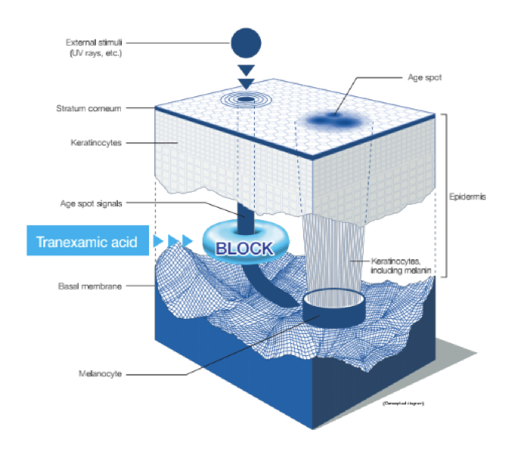 Sau đó, người ta phát hiện Axit Tranexamic có tác dụng ngăn ngừa hình thành melanin – nguyên nhân gây ra nám, tàn nhang – giúp làm trắng tận gốc
