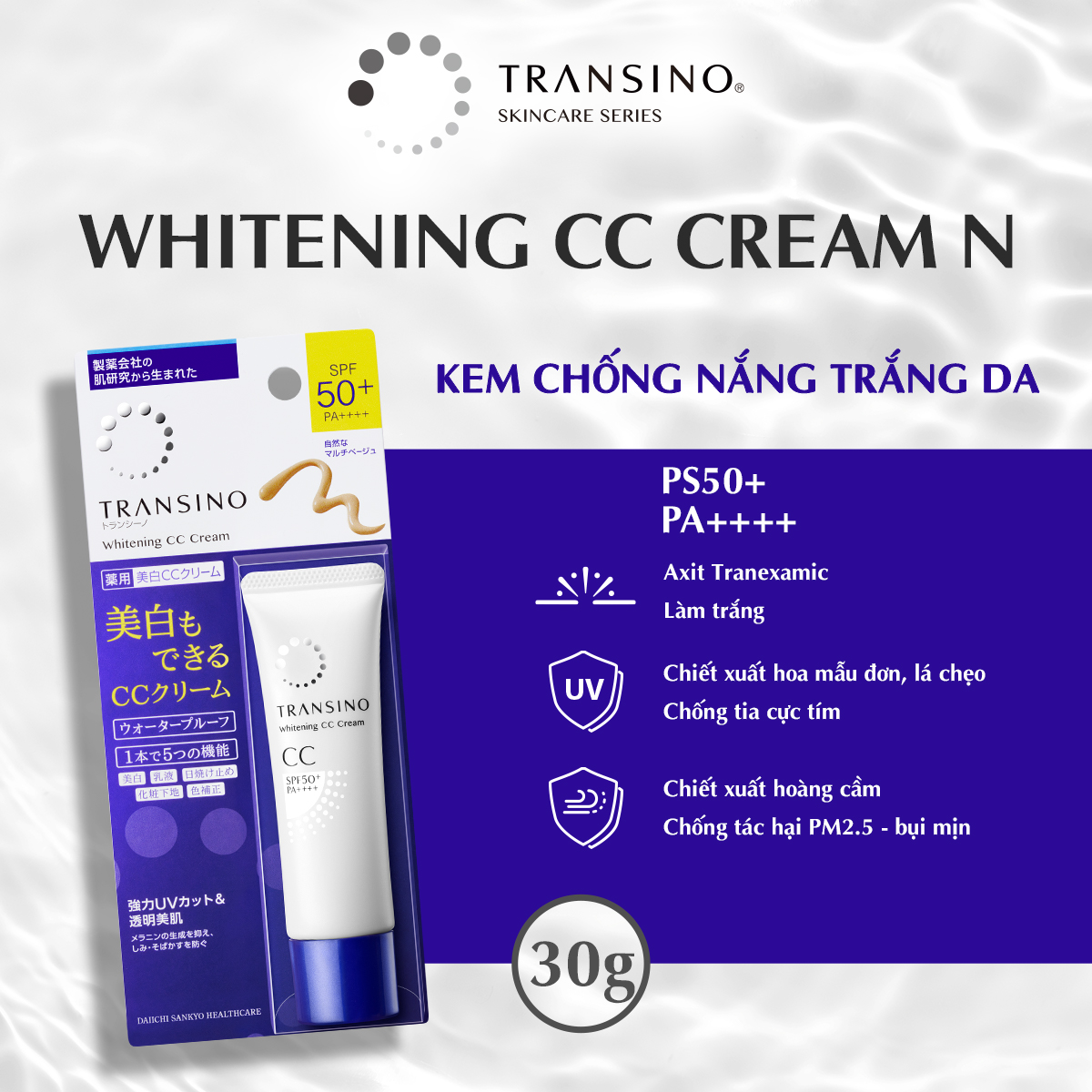 - Kem nền TRANSINO WHITENING CC CREAM là sản phẩm vừa trang điểm vừa dưỡng trắng da. Chỉ với việc dùng liên tục kem CC sẽ đem lại làn da với mặt mộc trắng sáng.